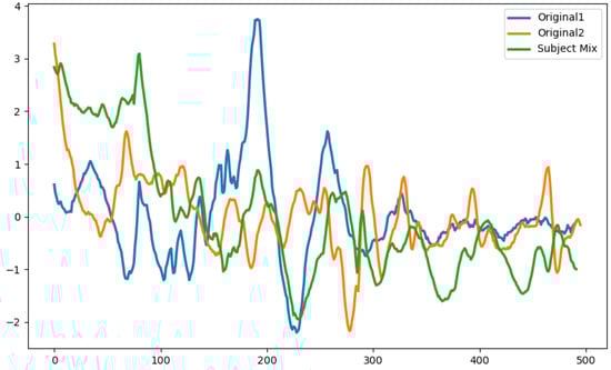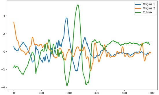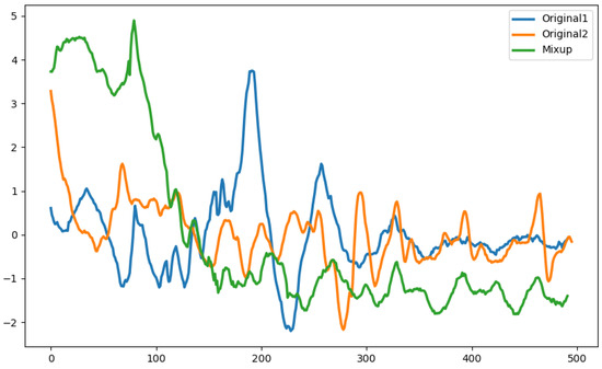 - Mixup: This is used to combine two randomly selected time series to create new sequences. During data blending, the mixing factor sets the fraction of values from each sequence [32]. It is mathematically represented by Equation (10):Here, represents the augmented sequences generated by blending sequences and based on the mixing factor . The values for are typically drawn from a beta distribution. Figure 15 demonstrates the actual and transformed data after applying mixup on CogAge atomic (bending) activity.