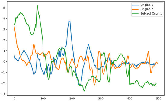 - Sub Cutmix: This technique involves the random replacement of segments from two different sequences belonging to different subjects. It improves dataset variety by combining information from various time series, which can strengthen the resilience and generalisation capabilities of time series models. Mathematically, it can be expressed by Equation (9)where denote a segment that is substituted from in . The indices i and k are randomly chosen to determine the start and finish positions of the segment substitution. Figure 13 demonstrates the actual and transformed data after applying transformation on CogAge atomic (bending) activity.