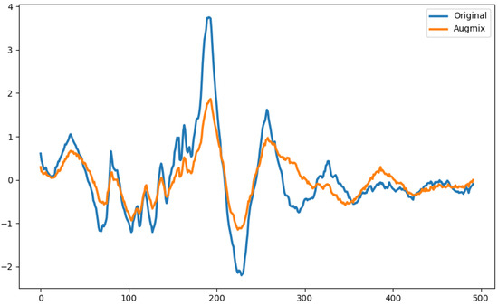 - AugMix: This uses three simultaneous augmentation chains with randomly selected augmentation operations. Three transformed sequences (smoothing, scaling, time warping) are created by consecutively applying these operations to the input sequence. The altered data are mixed with original data to create a new sequence. Incorporation of different transformation techniques directly into data increases the variability and robustness of models. Figure 14 demonstrates the actual and transformed data after applying AugMix on CogAge atomic (bending) activity.