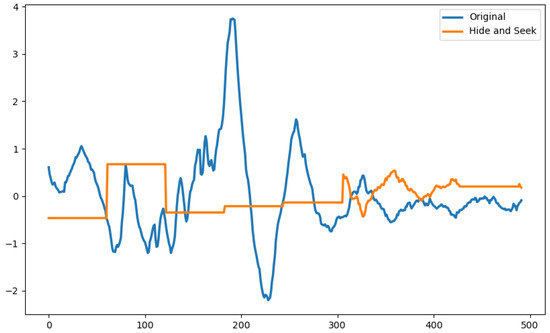 - Hide and Seek: This splits up sequences into a predetermined number of segments or intervals using the hide and seek strategy. Next, a random selection process is used to mask each segment with a specific probability, thus concealing its information. Random parts of the time series are eliminated by substituting the average of all the data points in the dataset for the masked segments. By replicating missing or noisy data, this approach increases variability and can improve the robustness of time series models. Figure 17 demonstrates the actual and transformed data after applying hide and seek on CogAge atomic (bending) activity.
