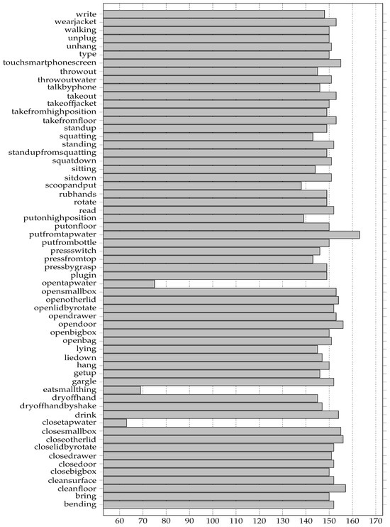 | Behavioural | Sit down, Stand up, Lie down, Get up, Squat down, Stand up from squatting, Open door, Close door, Open drawer, Close drawer, Open small box, Close small box, Open big box, Close big box, Open lid by rotation, Close lid by rotation, Open other lid, Close other lid, Open bag, Take from floor, Put on floor, Bring, Put on high position, Take from high position, Take out, Eat small thing, Drink, Scoop and put, Plug in, Unplug, Rotate, Throw out, Hang, Unhang, Wear jacket, Take off jacket, Read, Write, Type, Talk using telephone, Touch smartphone screen, Open tap water, Close tap water, Put from tap water, Put from bottle, Throw out water, Gargle, Rub hands, Dry off hands by shake, Dry off hands, Press from top, Press by grasp, Press switch/button, Clean surface, Clean floor. | |