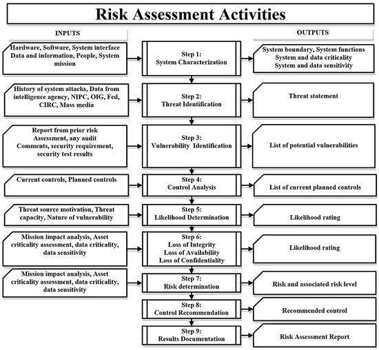 According to the NIST handbook, risk is defined as the probability that an external threat actor would take advantage of a security vulnerability and cause damage to the organization [53]. Using this strategy, firms may discover risk mitigation strategies. Figure 3 illustrates the nine steps of the risk assessment framework. The system encompasses a comprehensive examination of its description, identification of vulnerabilities and threats, detection of potential risks, evaluation of controls, prescription of control measures, and documentation of the results.