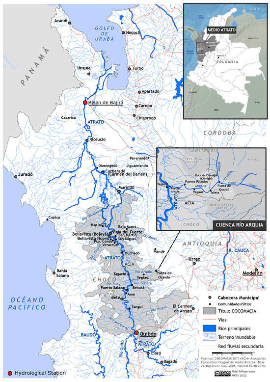 The Department of Chocó, on Colombia’s Pacific coast, is distinguished by its complex interaction among hydrology, geology, and climate []. The region has an extensive river network, headed by the Atrato River, which, while vital to the local ecosystem and communities, also represents a flood risk during the rainy season due to its fast flow and heavy rainfall. Geologically, Chocó has a diverse geology influenced by seismic and volcanic activity, with mountainous formations, valleys, and alluvial plains. All of this is framed by a rainy tropical climate, which, while favoring the region’s exceptional biodiversity, also poses challenges in terms of infrastructure and management of natural hazards [], such as floods and landslides. This complex interaction among the natural elements of the Department of Chocó defines its uniqueness and highlights the need for integrated and sustainable approaches to its management and development.