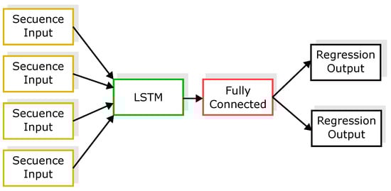 In Figure 4, the neural network starts with an input layer of sequences, followed by an LSTM layer. The neural network ends with a fully connected layer and an output regression layer.