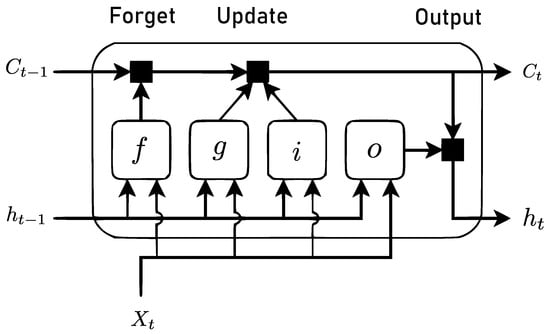 Moreover, LSTM is an architecture that emerged to alleviate these problems because, in RNNs, there is the problem that past data cannot be remembered for a long time; there are six parameters in total. Through the four-gate structure, not only short-term memory but also long-term memory can be solved. In our multivariable model, we employ the structure shown in Figure 3.