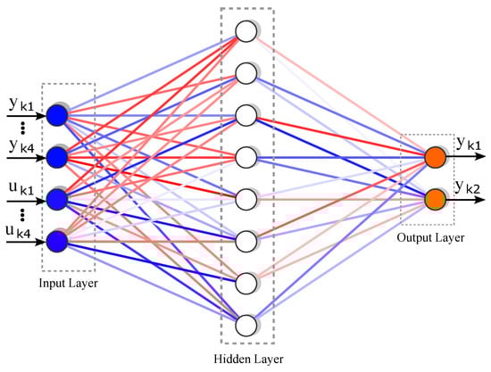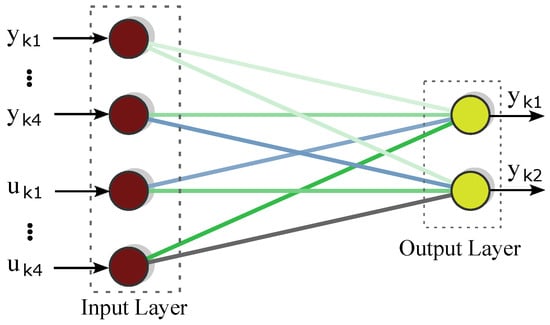 The NARX model (Equation (9)) has and as inputs, representing a 4th-order model () based on an analysis of the NARX and ARX models []. This choice, which is supported by research, entails 24 inputs and 2 outputs to account for the variables in Equation (8).