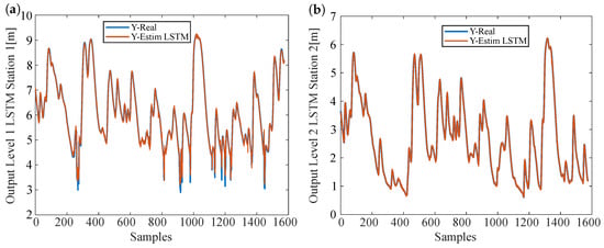 The outcomes of the LSTM method for both water level outputs are depicted in Figure 8. Specifically, Figure 8a displays the short-term estimation results for the first water level output juxtaposed with the actual measurements. Similarly, Figure 8b exhibits the short-term forecasting outcomes for the second water level output accompanied by the corresponding real measurements.