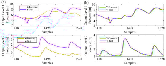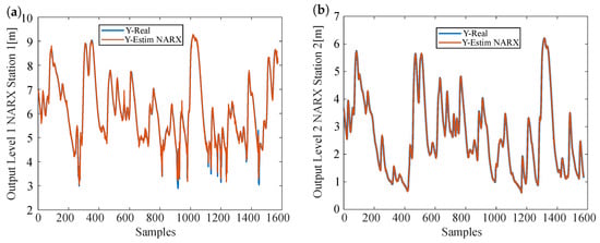 The outcomes of the multivariate NARX method for both water level outputs are presented in Figure 9, employing 64 nodes in the hidden layer, as specified in Table 2. Specifically, Figure 9a exhibits the short-term estimation of the first water level output in comparison with the actual measurements. Additionally, Figure 9b illustrates the short-term water level forecasting for the second output along with the corresponding real measurements.