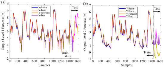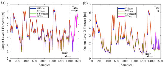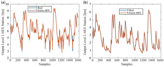 The results of the multivariate ARX method for both water level outputs are displayed in Figure 10, utilizing 64 nodes in the hidden layer according to the details in Table 3. Specifically, Figure 10a shows the short-term estimation of the first water level output compared to the actual measurements. Furthermore, Figure 10b presents the short-term water level forecasting for the second output along with the corresponding real measurements.