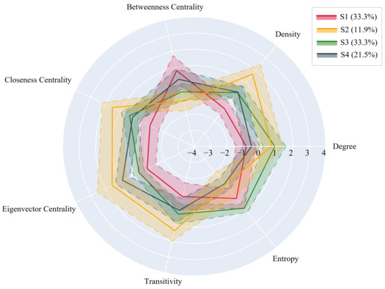 S1 was characterised by the lowest values for closeness centrality (−1.01 ± 0.60), degree (−0.84 ± 0.61), density (−1.03 ± 0.44), eigenvector centrality (−0.82 ± 0.58), and transitivity (−0.81 ± 0.85). In contrast, S2 was characterised by the greatest values for closeness centrality (1.53 ± 0.68), density (1.70 ± 0.76), eigenvector centrality (1.54 ± 1.00), and transitivity (1.34 ± 0.66), in addition to the second greatest value for degree (0.72 ± 0.67). S3 and S4 were similar in density (0.25 ± 0.52 and 0.28 ± 0.46), closeness centrality (0.36 ± 0.56, and 0.16 ± 0.51), and transitivity (0.30 ± 0.62 and 0.06 ± 0.75), which all lay between the associated values of S1 and S2. The degree and entropy scores for S3 (0.91 ± 0.68 and 0.89 ± 0.32) were higher than those of S4 (−0.51 ± 0.48 and −1.04 ± 0.46), while the eigenvector centrality scores for S3 (−0.27 ± 0.36) were lower than S4 (0.84 ± 0.47). The characteristics of the four offensive strategies are visually represented in Figure 2.