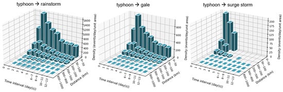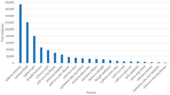 - The occurrence density of most patterns obeys the rule of decreasing with increasing temporal interval and spatial distance, but there are some exceptional patterns not obeying this rule: “heatwave → drought”, “drought → sandstorm”, “cold wave → hail/freezing damage/glaze ice”, and “continuous rainy days → landslide”.