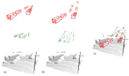 Comparison of quality. The detection outcomes in a KITTI validation scene are presented using various input point clouds through PV-RCNN and SAT in parts (a) and (b), respectively. Visualization is provided through a 3D point cloud. Ground truth boxes are highlighted in green, while red shows the bounding boxes’ predictions. Consequently, the ground truth boxes (encompassing object class features) on the right side in part (c) are deeper (i.e., more distant) from the LiDAR, posing a greater challenge for localization.
