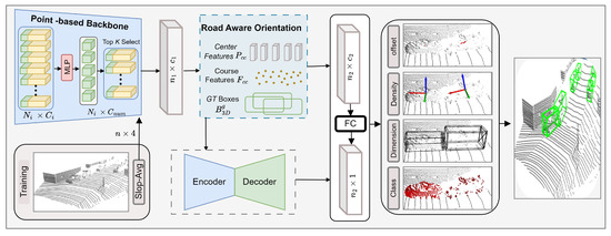 where represents road segmentation features and and denote object regression targets while each object center point is given by . Specifically, two MLPs were added after the encoding stages to predict the semantic classes of individual points. The point-wise one-hot-encoded semantic labels derived from the initial bounding box annotations are employed for guidance and supervision during this process.