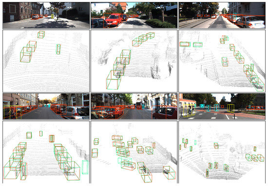 Visualization of object detection results in multiple views using the KITTI validation dataset. Green boxes represent predicted classifications, while red boxes indicate ground truth annotations.