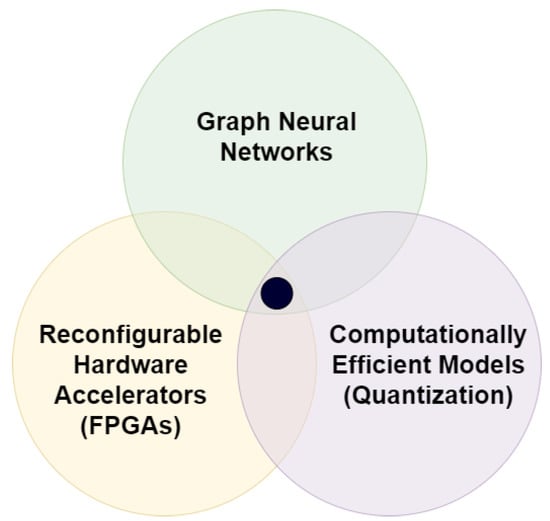 Compared to the Euclidean data used in classical neural network models, graph data require more computationally intensive resources [1]. The massive size of the data and the complexity of the connections increase the effectiveness of the GNN on graph datasets [19,20]. In addition, the irregular nature and instability of graph data pose several computational challenges [21]. Current GNN implementations for learning these complex datasets use frameworks such as the Deep Graph Library (DGL) [17], PyTorch Geometric (PyG) [22], and TensorFlow GNN [23]. These frameworks provide software support for graph neural networks on CPUs and GPUs, which are often used for convolutional neural networks (CNNs) and other well-known methods [24,25]. However, for embedded device applications such as edge devices, IoT, and mobile applications, generic frameworks are insufficient in terms of integration and efficiency. To overcome this problem, there are several works in the literature to build lightweight and fast GNN models. While these studies cover both traditional and embedded hardware, GPU and CPU implementations form a large part of the overall topic. Although the use of low-bit precision and Field-Programmable Gate Array-based (FPGA-based) accelerators to derive low-dimensional and real-time models is a well-known research topic in neural networks (NNs) [26] and convolutional neural networks [27], there has been insufficient research on GNNs [21,25,28,29]. Therefore, the study of quantized GNN models for accelerators is a promising potential research topic.