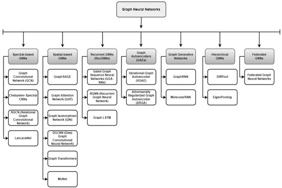 Designed to uncover patterns within graph data by scrutinizing the relationships between nodes and edges, GNN models offer an effective means of extracting insights from intricate network structures. Various GNN models with different characteristics are documented in the literature [63,64,65,66,67,68,69,70,71,72]. Figure 2 illustrates an updated taxonomy that categorizes GNN variants based on their intended applications, as delineated in the existing literature.