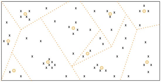 Figure 6 illustrates a vector quantization map, where Voronoi diagrams, depicted by dashed lines, play a crucial role in the quantization process. Each input vector is quantized relative to its Voronoi cell, with each x-point within these areas representing the vectors therein. The circles in the figure signify the codewords that most accurately represent the vectors in each region.