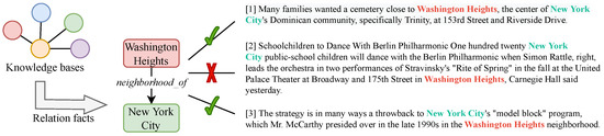 To this end, Ref. [1] proposed a novel learning paradigm, distant supervision, which automatically labels each instance by aligning the relation fact of the particular entity pair to knowledge bases (e.g., DBpedia [2] and Freebase [3]). Distantly supervised relation extraction (DSRE) is based on an overarching assumption: if two entities participate in a relation, then all mentions of the two entities are assumed to express that relation, significantly increasing the quantity of distantly annotated data. Unfortunately, the quantity of incorrect annotations also increases proportionally, eventuating into a new obstacle to overcome. As an example, shown in Figure 1, all the sentences in the corpus that contain “Washington Heights” and “New York City” would be presumed to reveal the relation fact “neighborhood_of”, which is not always the case.