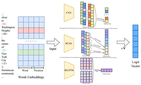 The CNN-, PCNN-, and ATT-BLSTM-based models, in which the input word embeddings and output logit vector are the same for the three models, but their relation representations are different and relative to their hyperparameters.