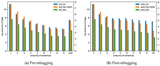 Nevertheless, as Figure 4a shows, the number of instances within bags is extremely imbalanced. Additionally, the biggest bags in the training and test datasets contain 2216 and 210 instances, and there are 1764 and 146 bags that contain at least 10 instances. Accordingly, we apply a rebagging process to reduce the instances within bags while holding the assumption of distant supervision; precisely, we split instances into new bags with the same annotations. Following the principle that the number of bags is in inverse proportion to the number of sentences within them, and we limit the maximum number of sentences in a bag to 10. As a consequence, we obtain the rebagged sizeable dataset, with the distribution of bags containing different numbers of instances as shown in Figure 4b.