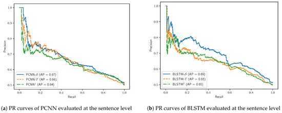 The PR curves of PCNN and BLSTM models evaluated at the sentence level, where the annotations in the legend are the same as the annotations in Table 2.