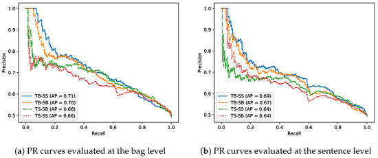 where m denotes the number of relations; for a specific relation i, indicates the number of true positive predictions, where the model correctly predicts that relation i exists in the bag. indicates the number of false positive predictions, where the model wrongly predicts that relation i exists in the bag. indicates the number of true false negatives, where the model wrongly predicts that relation i does not exist in the bag. Additionally, the sentence-level micro-averaged F1 score is the same as the bag-level one, but calculated at the sentence level.