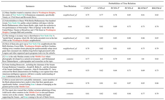 The predictions of a manually annotated bag are shown in Figure 7; we use the examples to clearly elaborate how our distillation model works and the differences between the teacher and student models. In addition, we list the predictions of three distillation models, as the figure shows that the student models usually have better performance than the teacher models and the predictions of the student models are more confident than the teacher models. More specifically, we designed two bags, each containing four sentences. In one of the bags, four sentences all contained the entity mentions of ‘Washington Heights’ and ‘New York City’. Moreover, the manual annotation of the bag was neighborhood_of, and three sentences reveal the relation, but one sentence does not. The four sentences in the remaining bag mention the entities “Middle East” and “Iran”, with the manual annotation contains. Similarly, three sentences reveal the relationship, while one sentence does not. According to the predictions of the teacher and student, we discover that benefiting from the knowledge of the teacher model, the student model increased the probability of a true relation for positive instances, and decreased the probability for negative instances. As a consequence, the student model has more correct and confident predictions at the bag and sentence levels. This means that our distillation framework is effective.