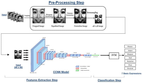 Figure 1 shows the general framework of the suggested model that includes three steps. The first step is preprocessing, including image cropping, image equalization, gamma correction, and downsampling. In the second step, the CCNN model extracts the features. Finally, the classification step is based on the SVM classifier. The proposed model is fully explained in the next subsections.