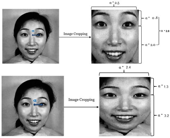 Many background details in the original image are unimportant to the emotion classification process. These details might make categorization less accurate because the classifier now has to distinguish between background and foreground, which is a new challenge. After cropping, any parts of the image that do not contain expression-related information are eliminated. Moreover, the cropping region is designed to exclude facial features that do not contribute to the expression, such as ears, portions of the forehead, and so on. Therefore, The distance ratio between the eyes is used to define the region of interest. As a result, this technique can manage various people and image sizes without human involvement.