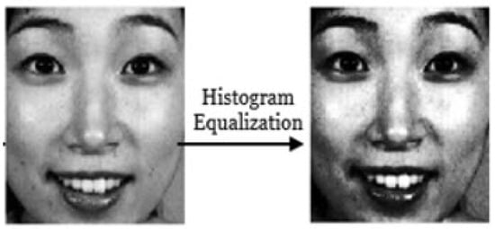 Let represent the histogram function of a set of resized face images consisting of n images. The function represents the cumulative function, while is the minimum non-zero value of the cumulative distribution function. The term indicates the total number of pixels in the image, where M represents the width, N represents the height, and L denotes the number of gray levels. An example of this stage is shown in Figure 3.