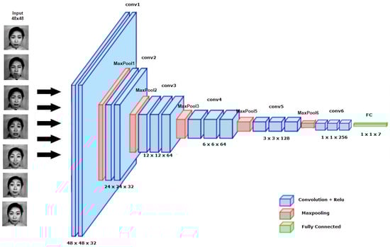 This section introduces the newly proposed convolutional neural network for feature extraction. The architecture of the Custom Convolutional Neural Network (CCNN) is shown in Figure 6. A grayscale image is provided as input to the network, and the output is the expression. The new CCNN architecture consists of six convolutional layers, each with a ReLU activation function, six batch normalization layers, five max pooling layers, and one fully connected layer. Finally, we used SVM instead of Softmax for the classification. The convolutional neural network parameters are presented in Table 3. The details of the proposed network are shown in Table 4.