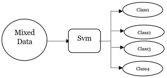 SVM is constructed based on statistical learning theory and the principle of structural risk minimization [], exhibits strong generalization capabilities, and can effectively tackle small sample problems. By employing the Gaussian kernel function method, SVM maps vectors from low-dimensional space to high-dimensional space to address classification problems, as shown in Figure 7.