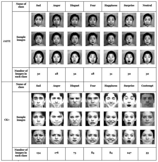 The facial expression recognition research made use of four renowned datasets commonly employed in this field: the Extended Cohn-Kanade (CK+) dataset, the Japanese Female Facial Expressions (JAFFE) dataset, KDEF dataset, and FER dataset. Both fundamental emotion datasets comprised seven categories: anger, disgust, fear, happiness, sadness, and surprise, in addition to neutrality for CK+ and contempt for JAFFE. Table 5 summarizes the dataset description, and Figure 8 shows a sample and number of images in each class.