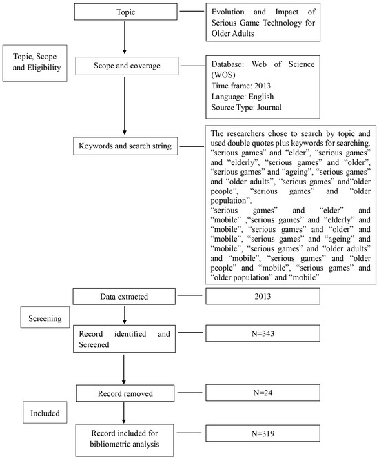We retrieved 319 relevant documents from the database spanning the years 2013 to 2024. The selection of this time frame is motivated by the fact that a majority of representative papers fall within this period. Another reason is to comprehensively analyze the evolution of serious game technology for older adults and identify shortcomings, necessitating a reasonable time span. In order to ensure the relevance and quality of the selected papers, when searching the Web of Science (WOS) database, the researchers chose to search by topic and used double quotes plus keywords for searching. The researchers excluded book reviews, conference papers, conference reviews, books, editorials, surveys, notes, and letters from the search results within the Web of Science (WOS) database. Apart from limiting the time frame and document types, we did not restrict citation topics, affiliations, publication names, countries and regions, publishers, research fields, funding agencies, and sustainable development goals. Various citation indices, including the Social Sciences Citation Index, Science Citation Index Expanded, Emerging Sources Citation Index, and Arts & Humanities Citation Index, were utilized for indexing.