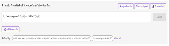 The flowchart depicting the process of the bibliometric review is illustrated in Figure 2. The review adopted a modified version of the Preferred Reporting Items for Systematic Reviews and Meta-Analysis (PRISMA) guidelines. A total of 24 articles were excluded from consideration as they were deemed irrelevant to the scope of this study, such as those focusing on research related to children. Figure 3 presents a query example for the terms “serious games” and “elder”, including a screenshot displaying the number of results obtained. This search process is then replicated for the additional keywords, as illustrated in Figure 2. The cumulative total of search results amounts to 343 items as of February 2024.