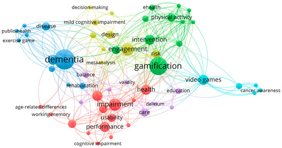 In Figure 4, six clusters of keywords are displayed. The first cluster, highlighted in red, consists of 14 keywords, including accessibility, age-related difference, Alzheimer’s disease, cognitive assessment, cognitive impairment, ecological validity, exergames, health, impairment, performance, self-managed rehabilitation, usability, virtual reality, and working memory. This cluster indicates the contribution of serious games for the elderly in the cognitive health domain, particularly with the application of VR technology.