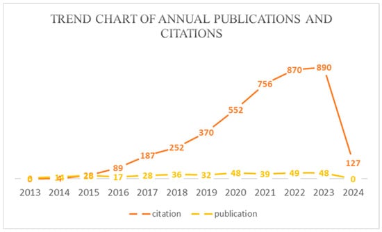 Analysis of the number of citations and publications over time from 2013 to 2024.
