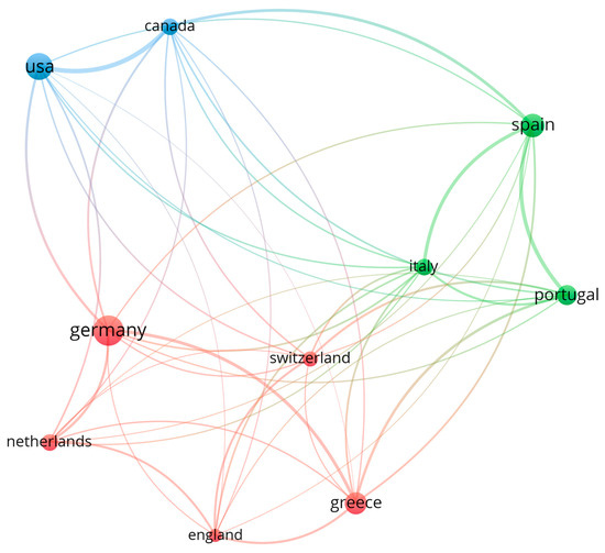 Figure 6 is a visualization diagram of the national bibliographic coupling network drawn through VOSviewer (1.6.20) software. Such network connection helps us find the intensity of citation connections between two or more countries in the field. Figure 4 shows that there are three clusters. The first cluster is shown in red and includes Germany, The Netherlands, Greece, England, and Switzerland. These countries show stronger bibliographic coupling, indicating that the citation rates between them are higher than in other countries. The second cluster is shown in green and includes Spain, Portugal, and Italy. The third cluster is Canada and the United States, shown in blue.