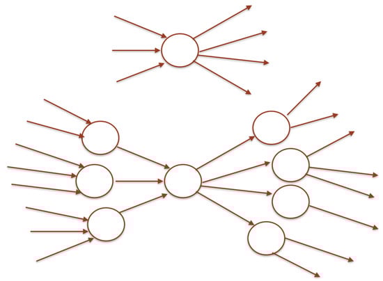 An ANN is given by a graph of nodes called neurons (identified by indexes) and edges called synapses. Each neuron is associated with a function, called the transfer (or activation) function of the neuron (with the same index as the neuron). Each neuron has afferent and efferent synapses that connect it to other neurons, receive values from the outside, or send values to the outside. The transfer functions are composed according to their links, because they take inputs from afferent synapses coming from other neurons, or outside, and provide results on the efferent synapses going to other neurons, or outside. Figure 1 shows a graphical description of a single neuron and a simple ANN where this neuron is connected with seven other neurons through its synapses. The modern notion of the artificial neural network is an evolution of the initial model by McCulloch and Pitts, emerging since the work []. Transfer functions associated with neurons are expressed by mathematical formulas with a single variable as an argument (polynomial, sigmoid, hyperbolic tangent, zero-linear, …).