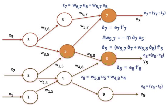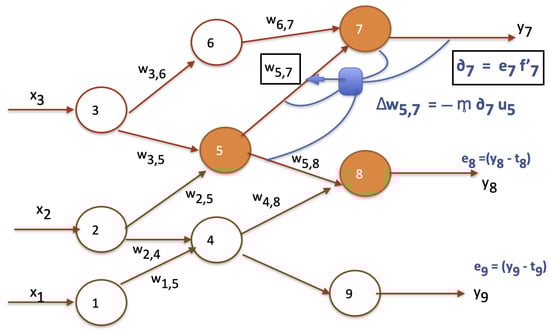 An ANN with 9 neurons updating weights and according to la backpropagation (in equation of the figure a stylized form of is used). The filled neurons are those involved in the considered weight updating.