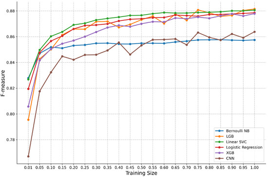 | Training Size | CNN | Bernoulli NB | LGB | Linear SVC | Log. Regr. | XGB |