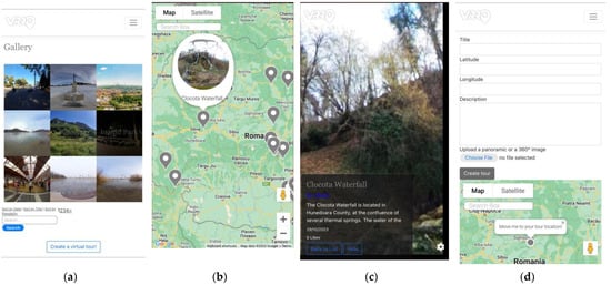 One of VRRO’s primary features is the VT gallery, which allows users to filter and search tours automatically ordered by popularity (Figure 1a). Additionally, an alternative viewing mode is provided through an interactive map, granting users a geographical perspective of the showcased locations (Figure 1b). These virtual tours are available as non-immersive VR, mobile AV with gyroscope sensor input, and fully immersive mobile VR with the help of smartphone VR mounts. The mobile VR functionality offers a highly immersive [73] yet low-interaction experience, allowing users to delve into static 360° VTs of diverse Romanian tourist attractions (Figure 1c).