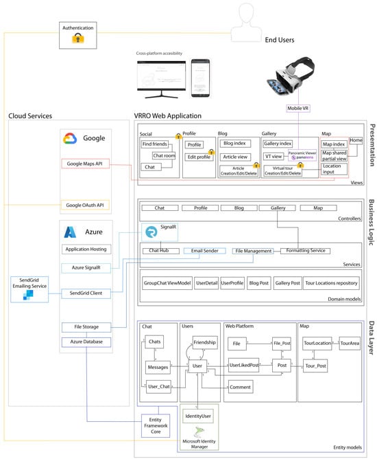 The Three-Tier architecture provides a structured approach by dividing the application into three distinct layers: the presentation layer, the business logic layer, and the data layer (Figure 6). Within this structure, the platform’s architecture is built on a robust and scalable NET Core framework [78], integrating a Model-View-Controller (MVC) design pattern that divides the application into logical units to enable efficient development, testing, and maintenance. Each functional module (Social, VT Gallery, Blog, and Map) consists of models, views, and controllers, using specific services or libraries that facilitate their functionality. The Entity Framework Core [79] is used in the backend for object-relational mapping, ensuring smooth data transactions with our Azure-hosted distributed database [80].