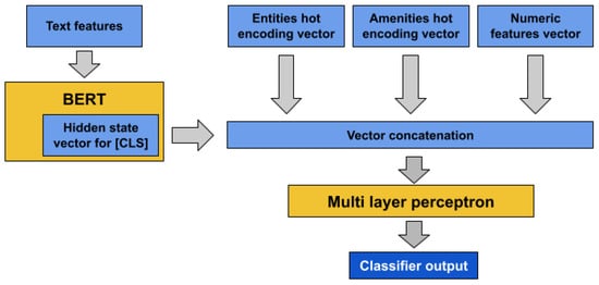 The tokenized text is processed by BERT (using the English uncased model; see the Hugging Face repository https://huggingface.co/bert-base-uncased, accessed on 15 June 2024). As BERT output, we adopt the hidden vector state associated with the first character of the input, which is represented by the [CLS] token. The tanh output of the pooling layer attached to BERT is scaled from 0 to 1 in order to be in the same range as other non-textual feature vectors. The numerical features are encoded as vectors of real numbers normalized from 0 to 1, while categorical and linked entities’ features are expressed as hot encoding.