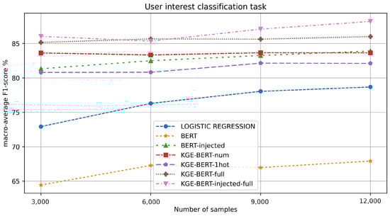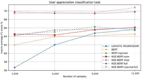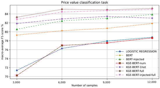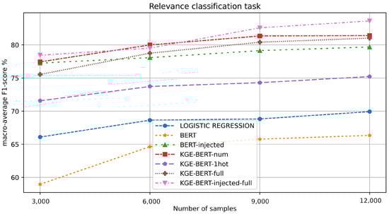 The results for this task are reported in Table 4 and in Figure 5. KGE-BERT-injected-full, again, yields the best results, especially with regard to the experiments using high numbers of training samples (9000 and 12,000). KGE-BERT-full is competitive, obtaining the best F1 score on 6000 training samples. As before, BERT-injected outperforms BERT.