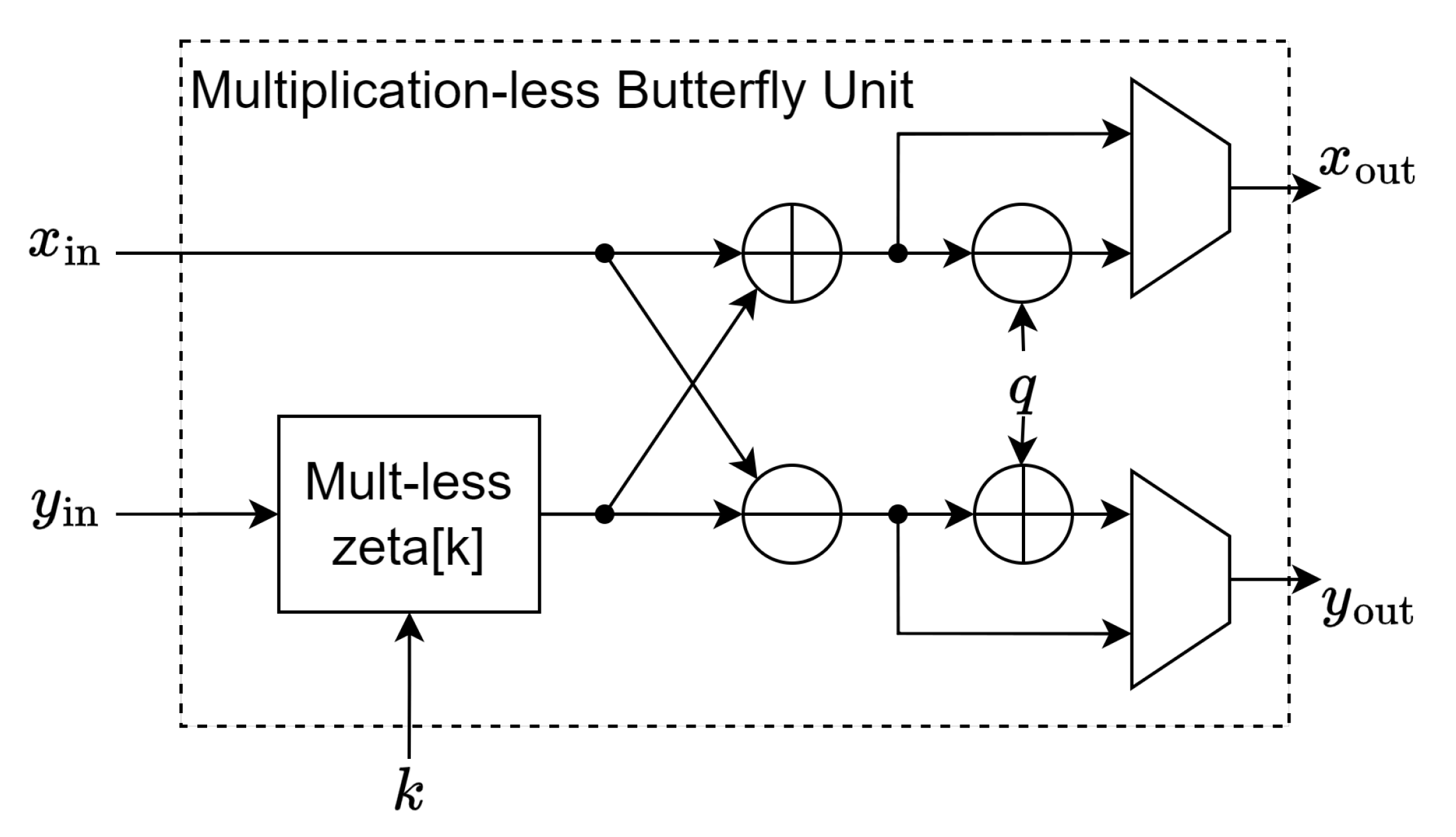 The zeta[k] multiplier submodule can be any modular multiplication module, such as the ones in Figure 3 or Figure 5. With intt_sel signal, when asserted, the butterfly unit acts as an inverse NTT butterfly unit, as in Equation (10).
