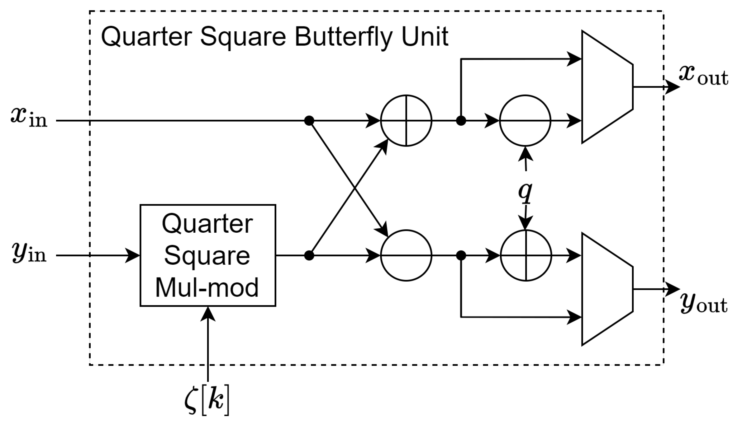 Similarly, when intt_sel is deasserted, the butterfly unit acts as a forward NTT butterfly unit, as in Equation (11).