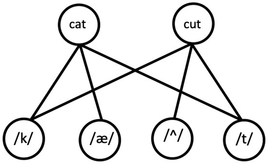 Although phonological similarity between words in spoken languages has been defined in a number of ways (e.g., [38,58]), the most common way to define a phonological neighbor (and the method employed in [3,32]) is derived from Levenshtein distance (a metric used in computer science to measure the similarity of two strings of characters). In this approach, a single phoneme in one word is added, deleted, or substituted to form another word [59,60], resulting in a connection being placed between those two words to represent the “phonological similarity” between those two words (see Figure 1). Using this Levenshtein-like definition of phonological similarity, [3] was able to have nodes represent English words and connections be simply present or absent between nodes—referred to as unweighted connections in [49].