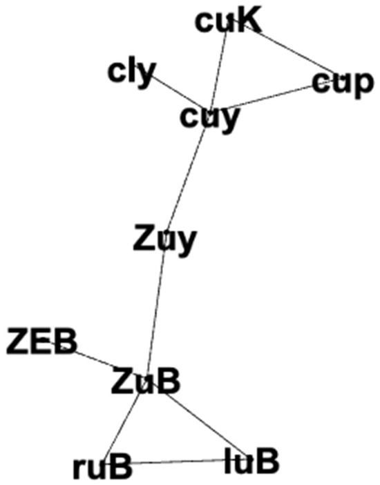 We obtained 303 CVC positional roots from [77] and transcribed them to computer-readable characters to represent each phoneme. Using the Levenshtein-like definition of phonological similarity used in [3], we created a network with roots being connected if changing one phoneme resulted in another root. Gephi (version 0.10.1; [55]) was used to visualize and analyze the resulting networks. A subnetwork showing tz’uy (represented as Zuy in the computer readable transcription), the neighbors of tz’uy (cuy and ZuB), and the neighbors of the neighbors of tz’uy (luB, ruB, ZEB, cuK, cly, and cup) is shown in Figure 3. Such subnetworks are referred to as 2-hop ego networks.