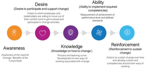 Stages of the ADKAR model. Adapted from www.prosci.com/es/metodología/adkar (accessed on 21 June 2024).